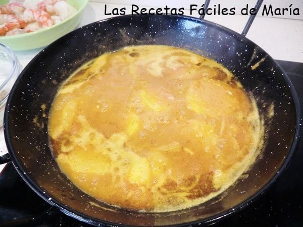 18.- Cubre con el fumet de pescado y marisco que hemos hecho, añade la picada de almendras, azafrán y ajo del mortero y mezcla con el guiso de pescado.