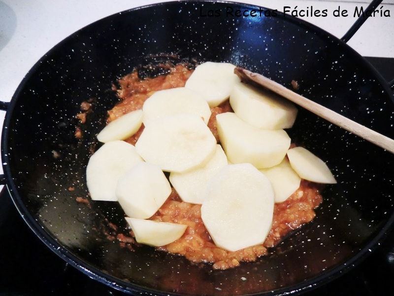 17.- Incorpora la salsa de tomate y las patatas cortadas en rodajas como de 1 cm de grosor.