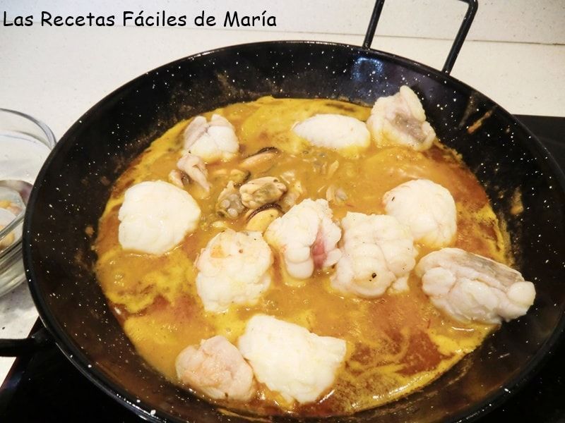 21.- Añade los gambones o langostinos, las almejas y clochinas o mejillones y deja reposar unos minutos.