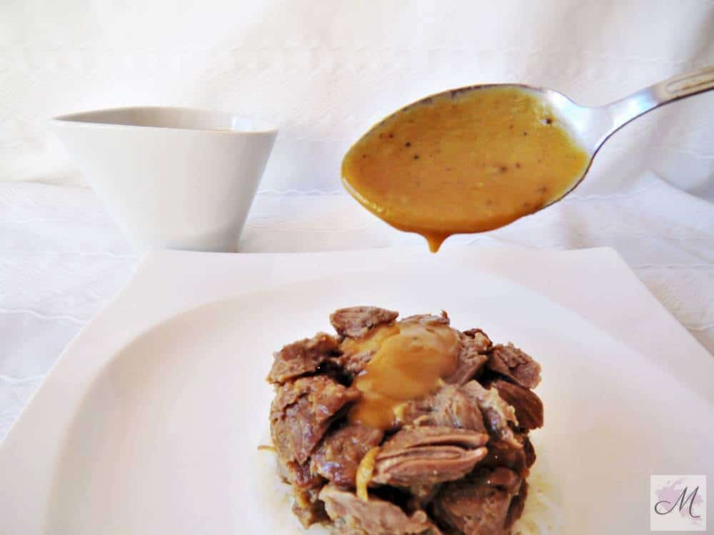 7.- Saca las carrilleras de la salsa, cuela la misma para quitar los granos de pimienta y los clavos de olor, y la hoja de laurel.